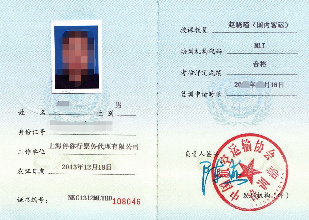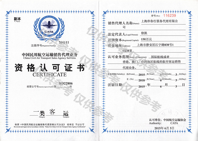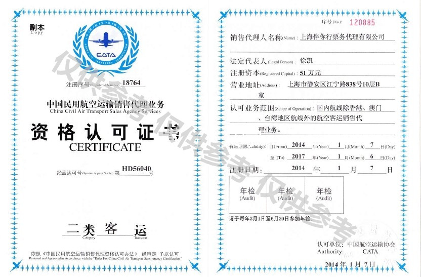CATA资格证书--机票代理销售资格证书 一类